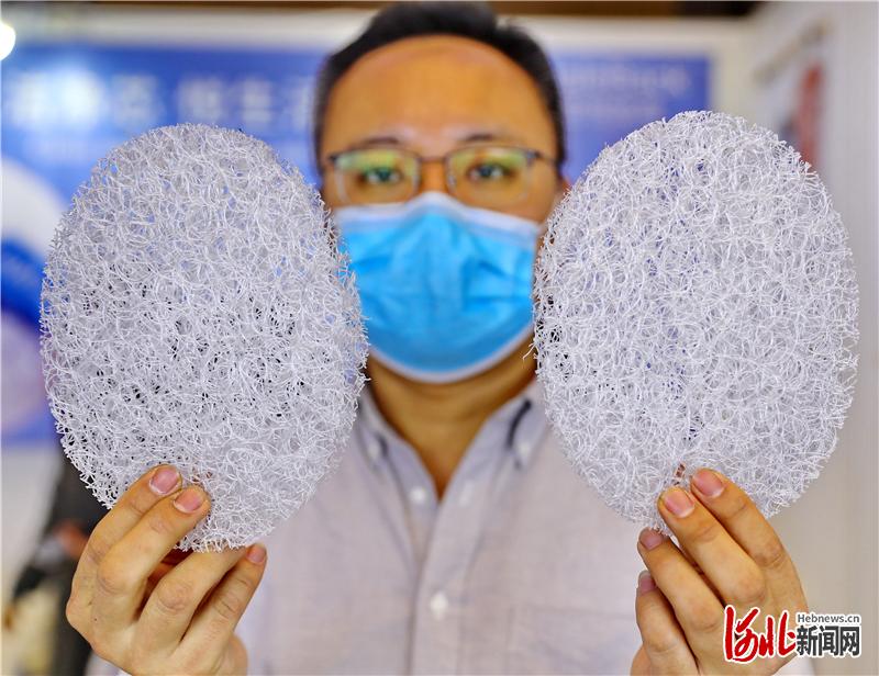 在康復(fù)輔助器具產(chǎn)業(yè)創(chuàng)新大會(huì)現(xiàn)場(chǎng),參展商展示高分子空氣纖維。河北日?qǐng)?bào)客戶(hù)端記者孫也達(dá)攝。