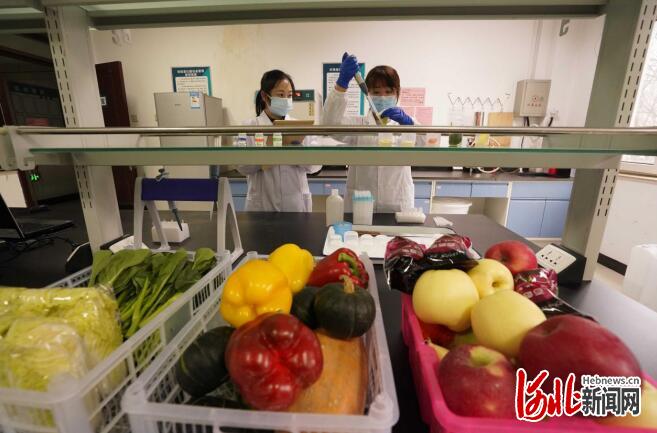 工作人員對(duì)蔬菜水果樣品進(jìn)行檢測(cè)。 王繼軍攝