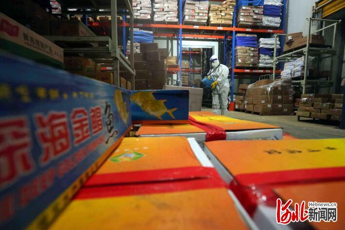 工作人員對(duì)國(guó)內(nèi)冷鏈商品進(jìn)行全面消殺。 王繼軍攝