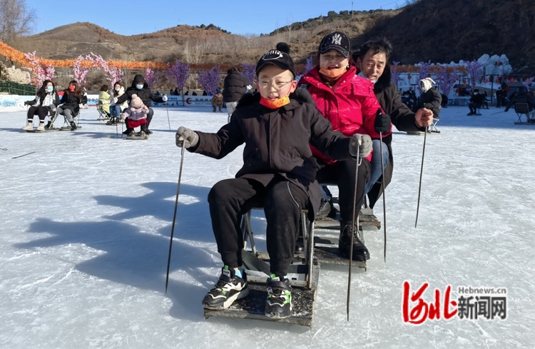 1月13日,秦皇島市民一家三口在老君頂景區(qū)體驗冰車運動的快樂。河北日報記者孫也達攝
