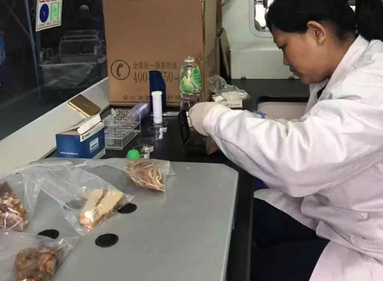 食品快檢車內(nèi)配置有食品檢測(cè)分析儀、離心機(jī)、攪拌機(jī)、超聲清洗機(jī)、旋渦混合器等檢測(cè)設(shè)備,能夠進(jìn)行蔬菜水果農(nóng)藥殘留、水產(chǎn)獸藥殘留、禽類獸藥殘留、肉類水分、瘦肉精、食用油酸價(jià)、亞硝酸鹽等數(shù)十幾個(gè)項(xiàng)目的快速檢測(cè)。主要用于食品快檢篩查、日常監(jiān)管、應(yīng)急處置和重大活動(dòng)食品安全保障工作。