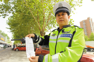 民警現(xiàn)場(chǎng)給違法車輛開(kāi)出罰單。