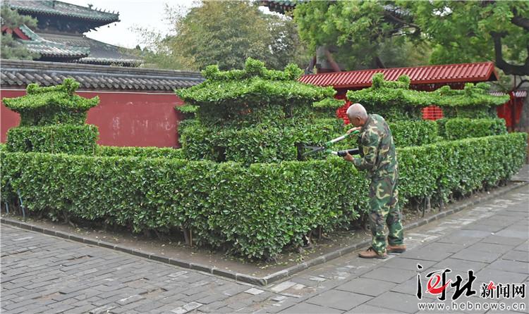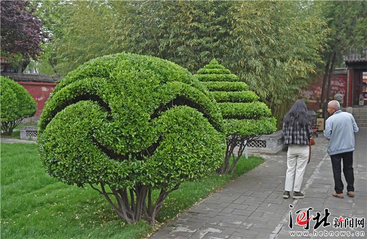 在隆興寺戒壇前,常綠植物冬青被修剪成了正定古城的造型。