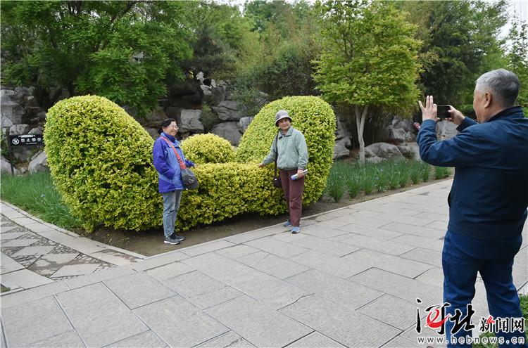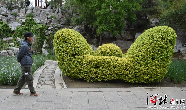 在隆興寺龍騰苑內(nèi),一個(gè)巨大的元寶狀植物造型前,很多游客駐足拍照留念。