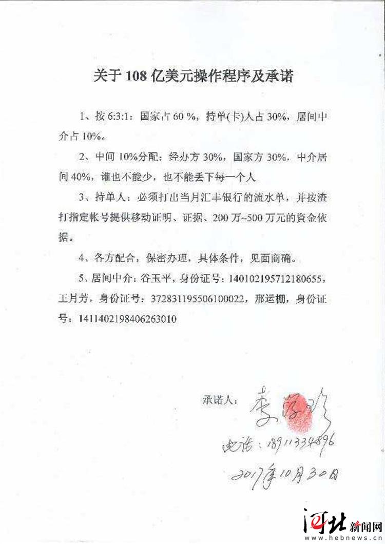 叔侄倆見到鄧某后,通過幾天的交談,他們對鄧某的“遭遇”深信不疑,并且表示愿意出錢出力幫助鄧某解決此事。于是鄧某拿出了一張《關于108億美金操作程序及承諾》的承諾書,上面寫著如何解凍存單及如何分配的詳細內(nèi)容。