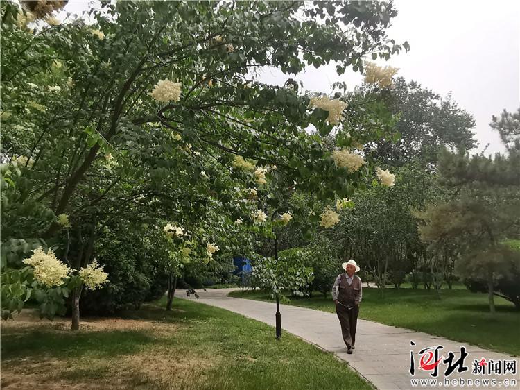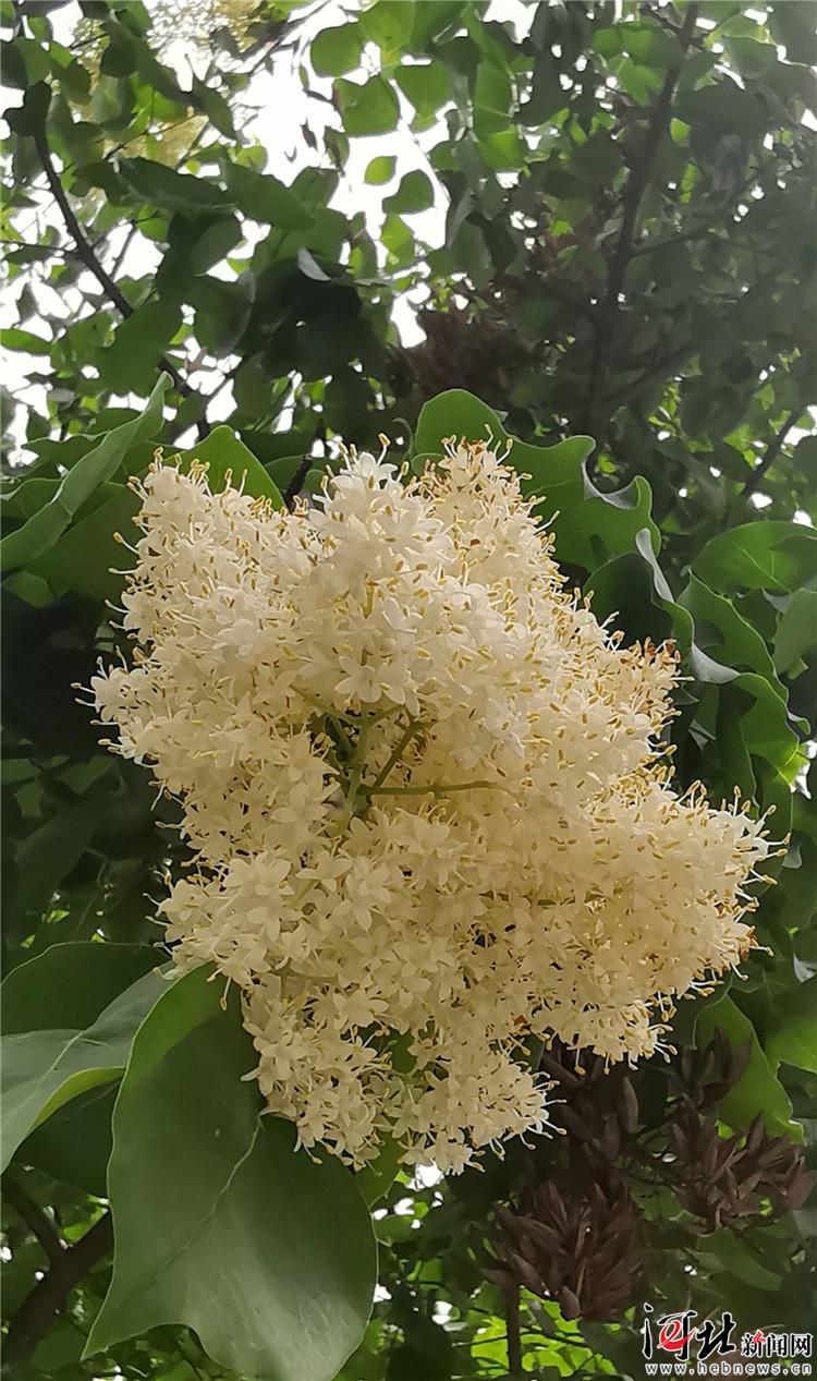 5月16日,記者在省會(huì)裕西公園“你好廣場”東面的園路上,遠(yuǎn)遠(yuǎn)地就看見廣場東南側(cè)有一大片開著白花的樹,滿樹的花朵又多又密,不等走近,一陣陣濃郁的花香撲面而來。丁香花的花期早過了,這花香可不是丁香冷冷的幽香,而是香得濃郁,濃得化不開。