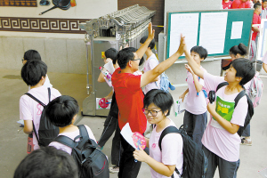 結(jié)束中考后考生擊掌慶祝。首席記者李青攝