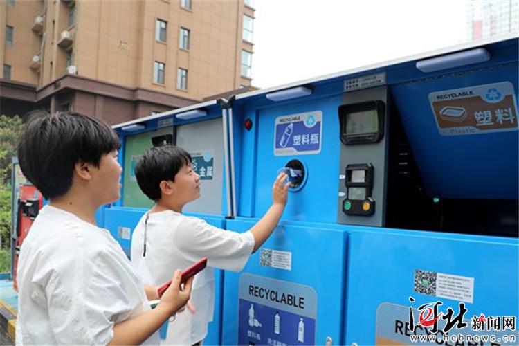 在鹿泉區(qū)的水岸華苑小區(qū)參觀的市民體驗(yàn)垃圾分類回收