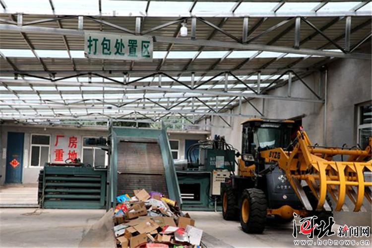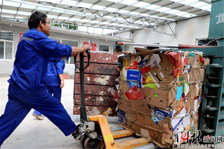 鹿泉區(qū)的工作人員取出打包機(jī)剛剛壓縮好的紙箱捆