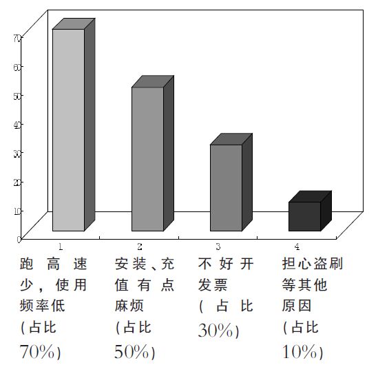 在記者調(diào)查中,確實有部分車主不太想裝ETC。問到原因,因為使用次數(shù)少而不想裝的情況最多。此外,還有擔心安裝、充值太麻煩,覺得開發(fā)票麻煩,以及擔心被盜刷等。