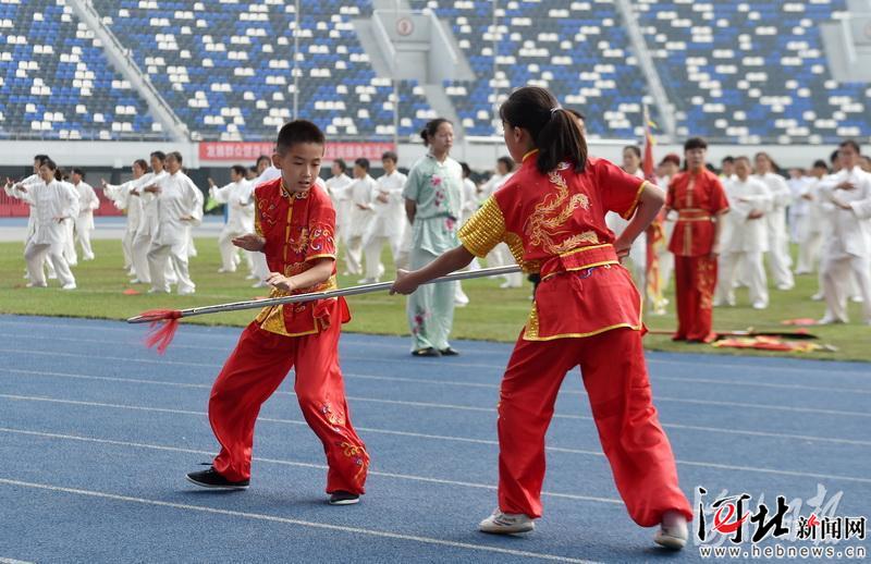 8月3日,石家莊市武術協會成員在進行表演對練表演。