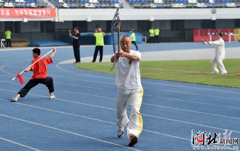8月3日,石家莊市武術協會成員在進行民間武術器械表演。