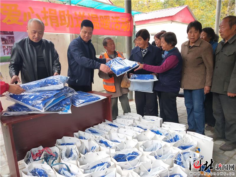 10月24日,平山縣灣子村的文化廣場,企業(yè)愛心人士為村民分發(fā)衣服。