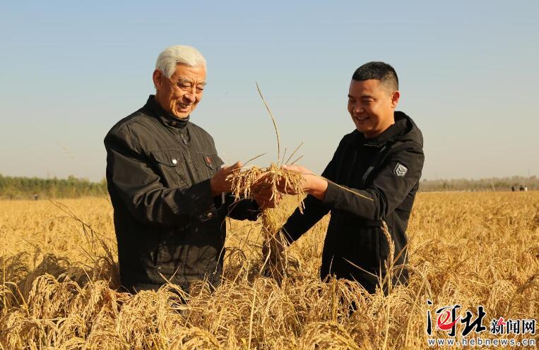 11月14日,河北省正定縣周家莊村村北的黑土地上,時隔20年后恢復(fù)種植的生態(tài)水稻迎來收獲季。圖為周家莊村黨支部書記張寧寧(右)和老支書王煥來查看成熟的水稻。 通訊員賈賀攝