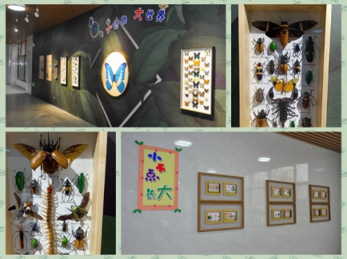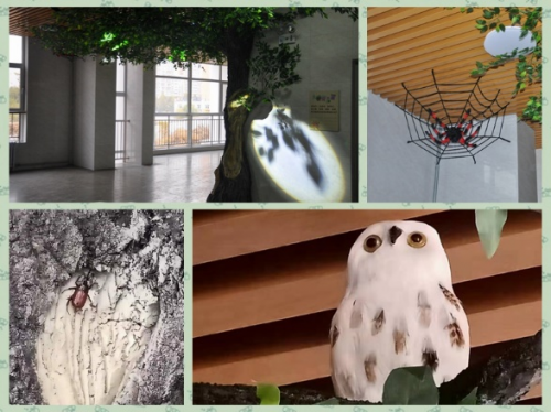 學校大廳中長約十米的沙灘生態(tài)箱中陳列了幾十種貝殼、海螺等海洋生物標本。綠樹成蔭的二樓廊道既是學生課間休息的場所,又是一座逼真的叢林生態(tài)博物館。蜘蛛、貓頭鷹、甲蟲等動物隱藏在繁茂的枝葉中,等待學生駐足尋找。標本區(qū)內多種蝴蝶標本、昆蟲標本、種子標本、植物標本整齊地陳列在此,向參觀學生無聲地講述大自然科學奧秘。自然生態(tài)博物館讓學生在相對真實的環(huán)境中獲得啟迪,增強人與自然和諧生存意識。
