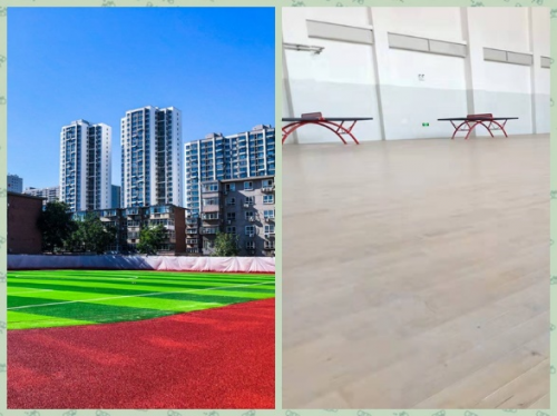 200米標準跑道的塑膠操場,擁有七人制足球賽的標準球場,操場四個方向安裝有戶外移動錄播設備,可現場直播足球賽,邀請場外教練在線指導。260平方米的室內運動館,木質地板、乒乓球臺、衣帽間、洗浴間等設施一應俱全,為學生提供了可在雨雪天氣進行鍛煉的場地。