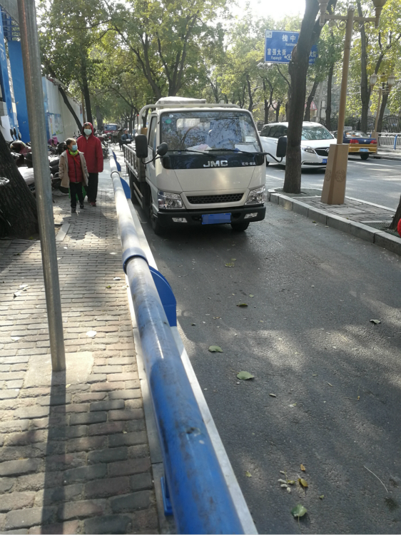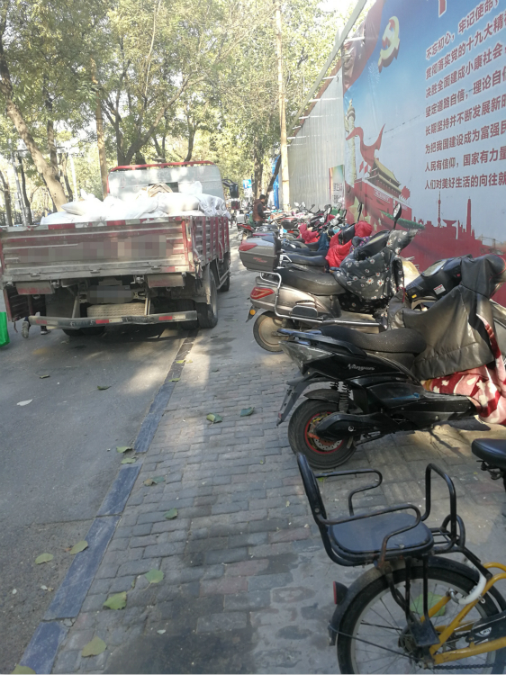 8日中午,筆者來到經(jīng)貿(mào)大學(xué)東苑小區(qū)西門,很多裝修工人將摩托車停放在便道上,貨車直接就停放在非機(jī)動(dòng)車道,占據(jù)了車道多半邊,電動(dòng)車只能小心行駛,而路過的行人在夾縫中艱難穿行,非常危險(xiǎn)。