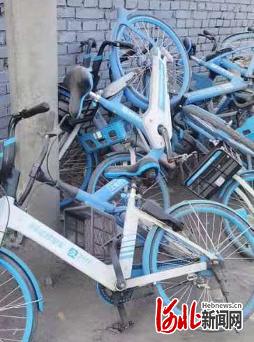 在石家莊市開發(fā)區(qū)北莊住宅區(qū)附近,筆者發(fā)現(xiàn)數(shù)十輛沾滿塵土、且有不同程度破損的哈啰單車或橫七豎八地疊放在一起,或被停靠在墻邊。路過的王先生告訴筆者,這些單車堆在這里至少得有一個多月了,很多車都壞了,不能騎,堆放在這里也一直沒見有人過來收攬整理!懊看纬鲩T路過這里,看到這些共享單車都覺得挺鬧心的,太影響市容市貌了!”