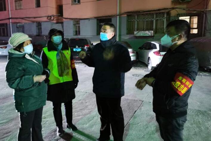 長(zhǎng)榮社區(qū)黨支部書記楊峰(左三)帶領(lǐng)社區(qū)黨員干部深夜堅(jiān)守。