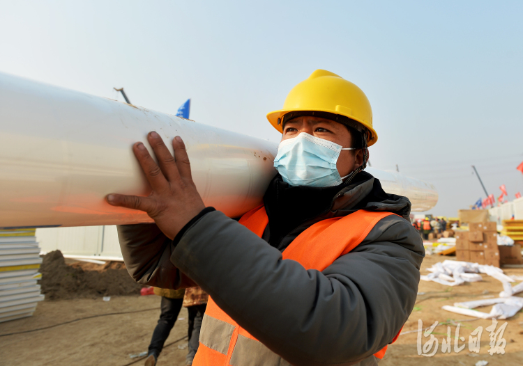 第一天進(jìn)入場地,眼前一片荒蕪,零施工基礎(chǔ),除了不時被寒風(fēng)卷起的黃沙,剩下的只有人。數(shù)九寒天,大家不怕冷不怕苦,董俊海四兄弟帶來的240多名工人,在中鐵建工集團(tuán)統(tǒng)一指揮部署下,開始土地平整、放線、打灰、吊裝、水電預(yù)埋、鋪裝等工作。