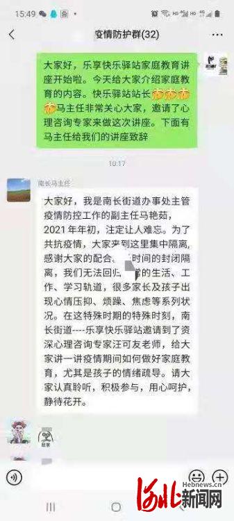 河北新聞網(wǎng)訊(王麗萍、陳立娟)疫情防空期間,為了緩解大家的長(zhǎng)期封閉生活造成的心理壓力,同時(shí)給予家長(zhǎng)特殊時(shí)期的家庭教育指導(dǎo),1月31日10時(shí),在南長(zhǎng)街道黨工委的大力支持下,馬艷茹副主任網(wǎng)上連線(xiàn)石家莊飛鴻教育個(gè)性化教育研究院心智化成長(zhǎng)心理咨詢(xún)專(zhuān)家汪可友,給家長(zhǎng)及孩子們上了一堂生動(dòng)有趣又發(fā)人深省的家庭教育課。
