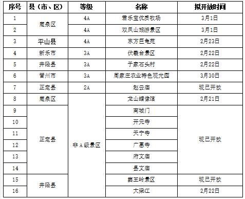河北新聞網(wǎng)訊(河北日報記者董昌)當前,河北省石家莊市疫情防控形勢持續(xù)好轉(zhuǎn),按照分區(qū)分級管控和應(yīng)開盡開原則,石家莊市文化廣電和旅游局發(fā)布了第二批開放旅游景區(qū)名單。各開放景區(qū)要繼續(xù)嚴格落實疫情防控各項措施,認真做好身份證識別和登記工作。現(xiàn)將有關(guān)事項通告如下: