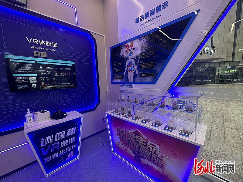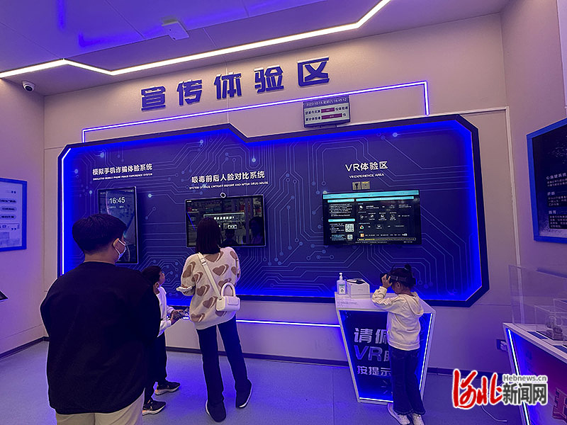 走進(jìn)宣傳體驗區(qū),里面已經(jīng)有七八位市民正在體驗。記者看到,宣傳區(qū)里設(shè)有個人信息途徑泄露認(rèn)知系統(tǒng)、模擬手機(jī)詐騙體驗系統(tǒng)、吸毒前后人臉對比系統(tǒng)、VR體驗區(qū)和毒品模型展示板塊。在VR體驗區(qū),記者親身體驗了家庭失火逃生模擬。帶上VR眼鏡,一間燃著熊熊大火的房子突然出現(xiàn),讓人身臨其境。按著逃生提示指引,記者一步步選擇正確的逃生路線,完成逃生體驗,“實戰(zhàn)”掌握了火場逃生技能。