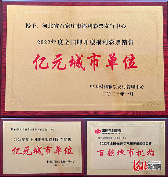 2022年,石家莊市福利彩票發(fā)行中心先后榮獲中福彩頒發(fā)的2022年度全國(guó)即開(kāi)型福利彩票銷售億元城市單位、2022年全國(guó)快樂(lè)8游戲銷售技能擂臺(tái)賽百?gòu)?qiáng)地市機(jī)構(gòu)的獎(jiǎng)牌。