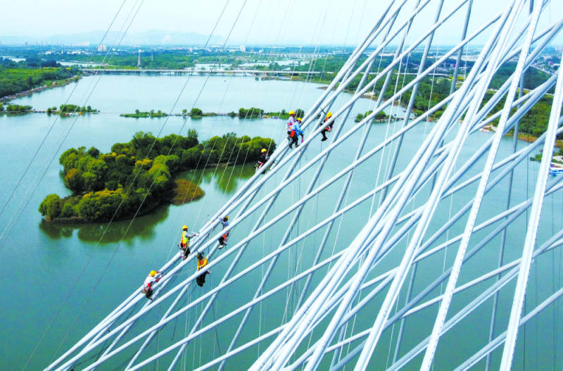 9月20日,在石家莊市復(fù)興大街跨滹沱河特大橋建設(shè)現(xiàn)場,施工人員正進行亮化工程施工,安裝照明設(shè)施。滹沱河特大橋是復(fù)興大街市政化改造項目的重要節(jié)點工程,全長約2208米,主塔總高146.5米,采用雙向10車道設(shè)計標(biāo)準(zhǔn)。記者董永博攝