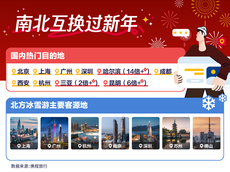 日前,攜程發(fā)布的《2024春節(jié)旅游市場預測報告》也顯示,北方冰雪、南方溫泉避寒“南北互換”游的形式是國內游大熱門,春節(jié)期間總體旅游訂單同比增長超7倍。