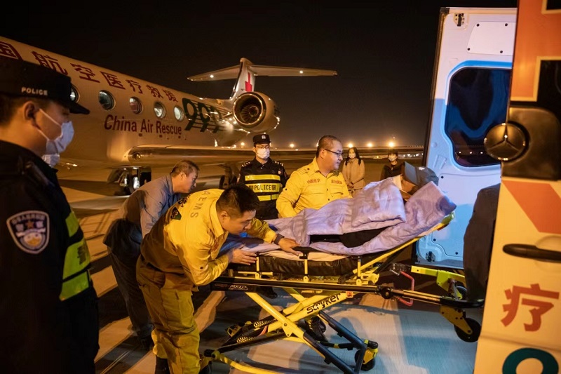 12日23時許,急救旅客及陪同家屬、醫(yī)務人員抵達停機坪。在一旁等候的移民管理警察順利對接,搶抓時間為相關人員辦理入境手續(xù),全力為傷者救治贏得寶貴時間。