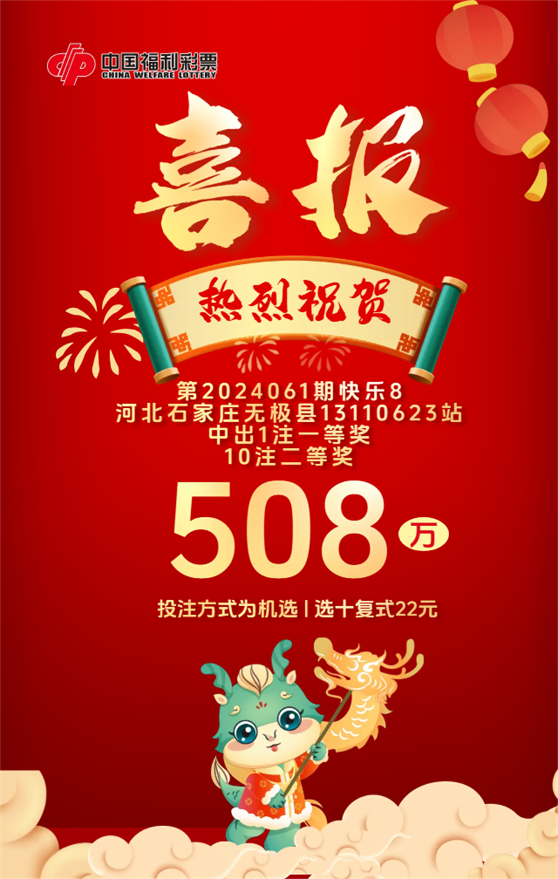 縱覽客戶端訊(縱覽新聞記者蔡艷榮)二月二龍?zhí)ь^,彩運當(dāng)頭 。3月11日,農(nóng)歷二月初二,在甲辰龍年龍?zhí)ь^的大喜日子,全國中出一注快樂8選十中十大獎,這注大獎花開石家莊。