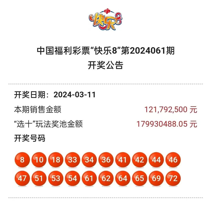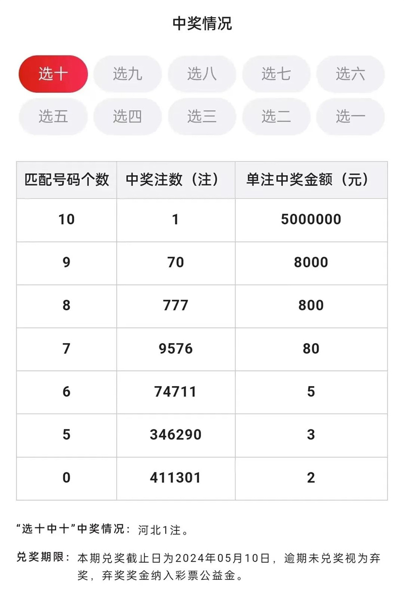 3月11日晚,快樂8第2024061期開獎,中出“選十中十”500萬元大獎1注,大獎花落河北。