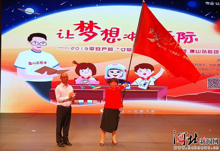 5月27日,2019平安產(chǎn)險“寸草安心”公益支教行動唐山站啟動儀式舉行。圖為支教志愿者代表舉起志愿旗幟。記者王育民攝