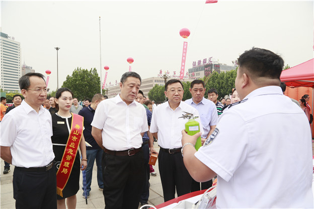 來自路南區(qū)和路北區(qū)的腰鼓隊和鑼鼓隊用一陣陣激蕩人心的鼓點敲響了活動啟動的樂章。唐山市委常委、常務(wù)副市長付振波,唐山市政府副秘書長崔敬學(xué)在唐山市安委辦主任、唐山市應(yīng)急管理局黨組書記張寶才和唐山市安委辦主任、唐山市應(yīng)急管理局局長于興維的陪同下參與了宣傳活動。到達(dá)現(xiàn)場后,付振波來到了廣場應(yīng)急管理業(yè)務(wù)咨詢區(qū),認(rèn)真參觀了各單位安全生產(chǎn)與應(yīng)急管理工作宣傳展板,一邊聽取各單位負(fù)責(zé)人的介紹,一邊就感興趣的問題向工作人員頻頻提問!斑@是最新型的逃生緩降器,可以在火災(zāi)現(xiàn)場利用它安全著陸,避免發(fā)生危險。”在消防器材展示區(qū),付振波拿起面前的逃生緩降器,用力拉了拉伸出的繩索,隨后又?jǐn)Q亮了一支多功能安全應(yīng)急手電筒。聽完工作人員介紹最新型安全應(yīng)急器材的性能和優(yōu)點后,付振波不住點頭,與隨行人員交流著配備應(yīng)急裝備器材的重要性。