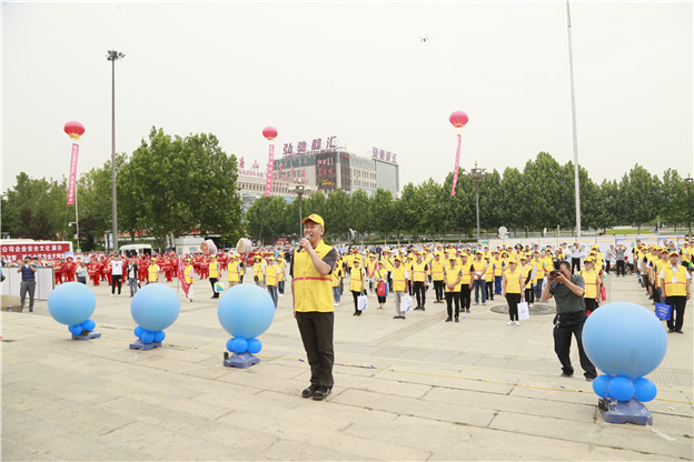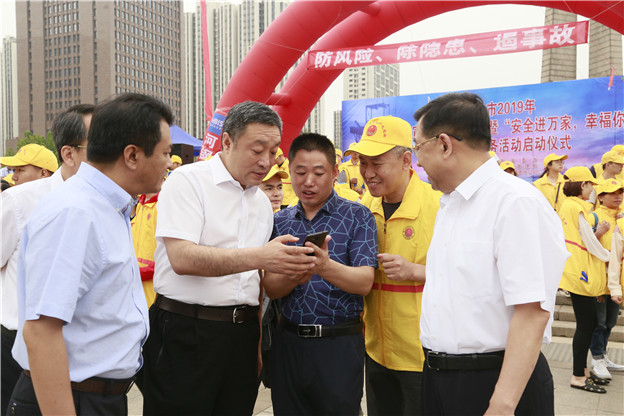 參觀結(jié)束后,唐山市“安全進(jìn)萬家,幸福你我他”主題志愿服務(wù)活動啟動儀式正式開始。廣場上180名來自全市各單位、各重點企業(yè)的安全生產(chǎn)志愿者們整齊列隊,飄灑的細(xì)雨無法熄滅大家的激情,在志愿者代表從副市長付振波手中接過志愿服務(wù)主題隊旗后,志愿者們高舉右拳,面對隊旗莊嚴(yán)宣誓,表達(dá)了“服務(wù)大局、奉獻(xiàn)社會、溫暖他人、彰顯愛心”的堅定決心。隨后,付振波宣布活動正式啟動,參加活動的領(lǐng)導(dǎo)們按下活動啟動球,無數(shù)只彩色氣球隨之飄向天空,預(yù)示著唐山市“安全進(jìn)萬家,幸福你我他”主題志愿服務(wù)活動正乘風(fēng)而起,飛向全市各個角落,將安全生產(chǎn)、護(hù)佑平安的愛心灑向整個鳳凰城。唐山市安委辦主任、市應(yīng)急管理局書記張寶才作了動員講話,希望廣大志愿者們用愛心傳承文明、用真情奉獻(xiàn)社會、用行動捍衛(wèi)誓言,為建設(shè)國際化沿海強市作出新的貢獻(xiàn),更為迎接建國70周年偉大歷史時刻營造安全穩(wěn)定的社會環(huán)境。付振波高度關(guān)注全市安全素質(zhì)提升工作。6月16日,是2019年全國“安全生產(chǎn)月”;芳叭癜踩珣(yīng)急知識競賽進(jìn)行的第16天,是河北省“中國人壽財險杯”應(yīng)急知識網(wǎng)絡(luò)競賽活動首日,為帶動和動員全市各單位干部職工及廣大市民積極參與答題活動,傳播安全生產(chǎn)理念,積極普及應(yīng)急知識,付振波現(xiàn)場用手機參與了河北省和全國網(wǎng)絡(luò)答題,為全市保持競賽領(lǐng)先地位躬親示范。啟動儀式后,志愿者們立即分成多個隊伍,深入萬達(dá)廣場、百貨大樓及附近小區(qū)分發(fā)宣傳資料,將安全生產(chǎn)知識送到群眾手中。
