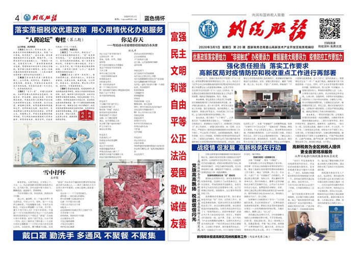 新冠肺炎疫情發(fā)生以來,該局應時輯印了《納稅服務—戰(zhàn)“疫”特刊》,第一版重點設立《戰(zhàn)疫情 促發(fā)展 高新稅務在行動》欄目,集中反映高新稅務內(nèi)防內(nèi)控、聯(lián)防聯(lián)控,拓展“非接觸式”辦稅繳費,營造安全、高效辦稅環(huán)境等重點工作;第二、三版重點設立《戰(zhàn)“疫”稅費政策》欄目,重點匯集當下最新稅收政策、最新服務舉措;第四版重點設立《抗“疫”論壇》《戰(zhàn)“疫”防護知識》《戰(zhàn)“疫”書法、繪畫、詩歌》等欄目,弘揚正能量,歌頌“白衣天使”“奮戰(zhàn)在抗‘疫’一線的勇士”。