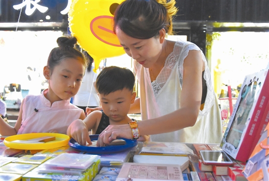 7月20日,河北省唐山市豐潤區(qū)中嘉大道夜間市場內(nèi),小朋友在家長的陪同下選購益智玩具。