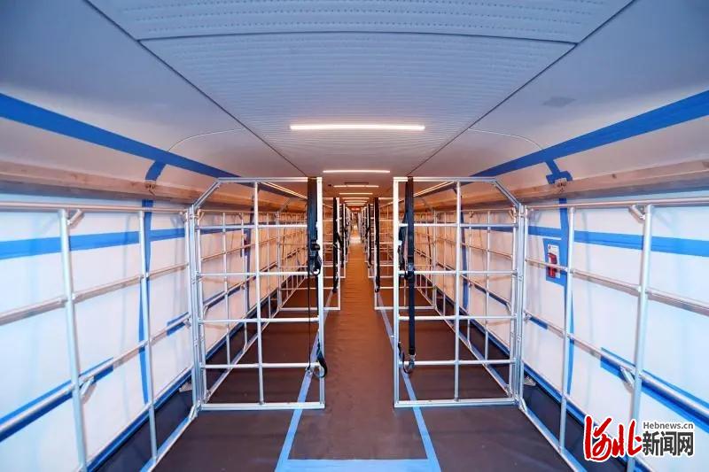 擔(dān)當車次任務(wù)的CR400BF-3087“復(fù)興號”高速動車組上,車廂內(nèi)原來的座椅全部被移除,取而代之的是一排排的貨架側(cè)墻。中車唐山公司供圖