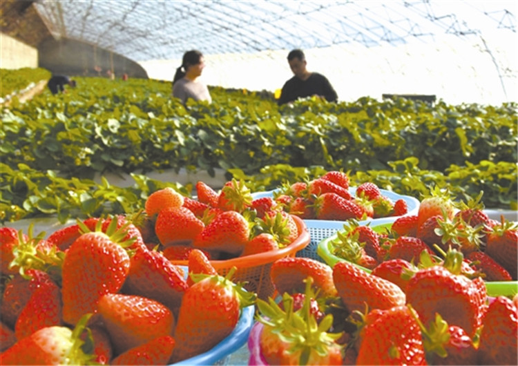近年來,唐山市豐潤區(qū)積極推動農(nóng)業(yè)產(chǎn)業(yè)結(jié)構(gòu)調(diào)整,大力發(fā)展高附加值特色農(nóng)業(yè),助力農(nóng)民走上增收致富路。圖為1月11日,沙流河村農(nóng)民在采摘草莓。 齊磊攝影報道