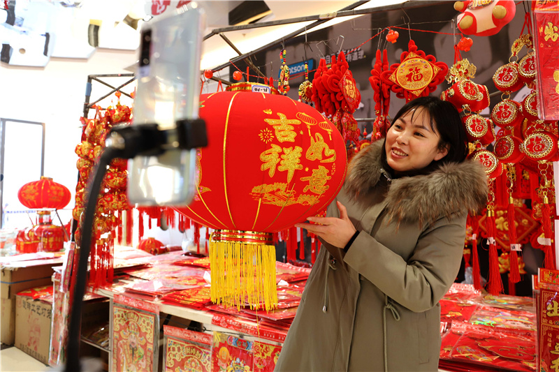 2月8日,在河北省唐山市海港經(jīng)濟開發(fā)區(qū)年貨市場,工作人員在線上直播銷售春節(jié)飾品。