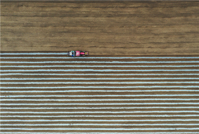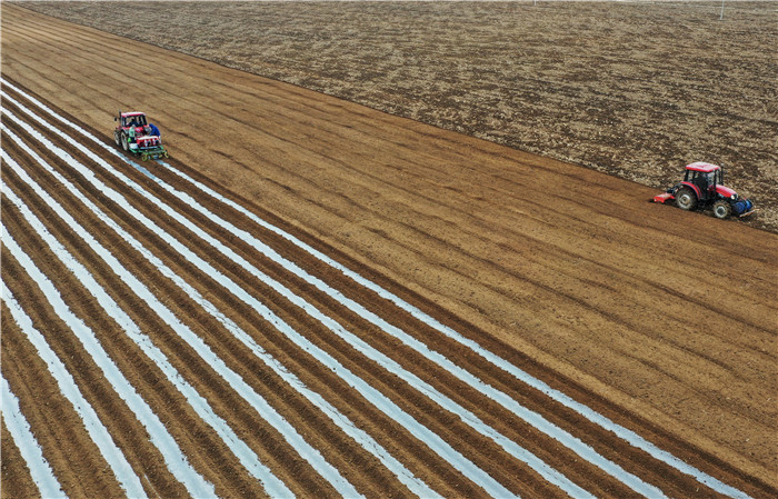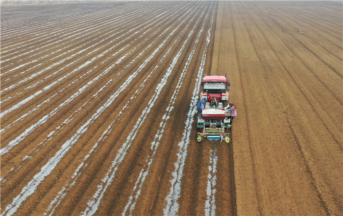 3月11日,河北省唐山市豐南區(qū)小集鎮(zhèn)起莊子村的農(nóng)民在使用機(jī)械設(shè)備播種馬鈴薯(無(wú)人機(jī)照片)。