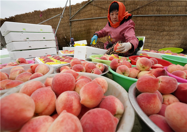 3月18日,樂(lè)亭縣新寨鎮(zhèn)大港村一位農(nóng)民將剛采摘的鮮桃裝箱。