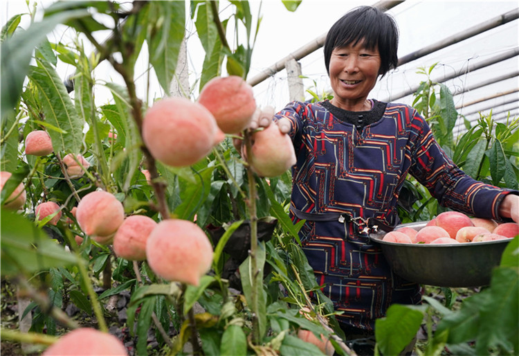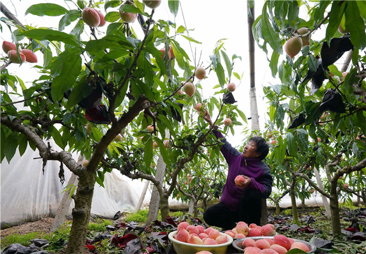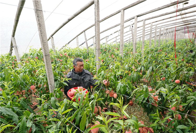 3月18日,樂(lè)亭縣新寨鎮(zhèn)大港村一位農(nóng)民在自家大棚內(nèi)采摘鮮桃。