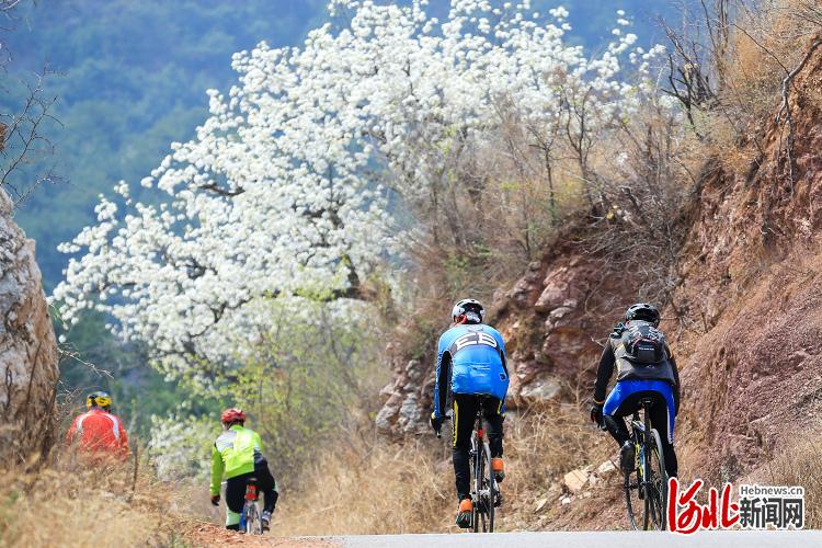 2021年4月5日,騎行愛好者在唐山市遷西縣新莊子鄉(xiāng)賞花游覽。