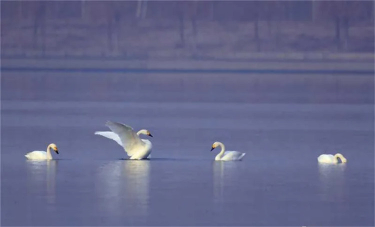 天鵝在河北省遷安市黃臺湖水面上游戲。