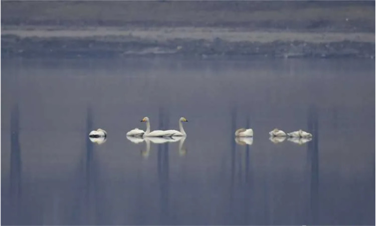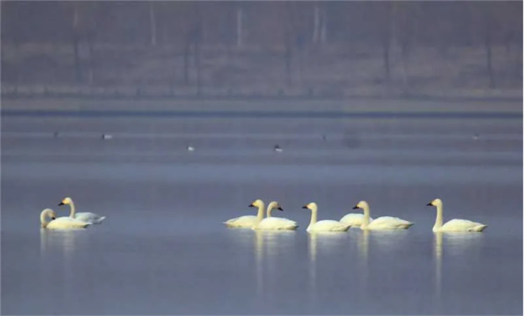 天鵝在河北省遷安市黃臺湖水面上休憩。