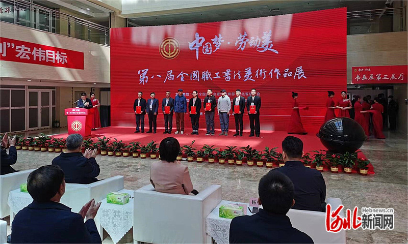 4月16日上午,“中國夢·勞動美”第八屆全國職工書法美術(shù)作品展在河北省唐山市工人文化宮開幕。圖為開幕儀式上,領(lǐng)導(dǎo)和嘉賓為獲獎作者頒獎。河北日報記者李寶發(fā)攝
