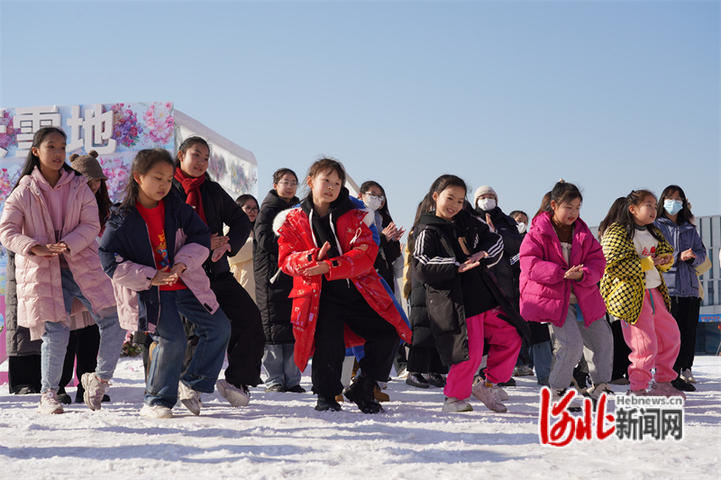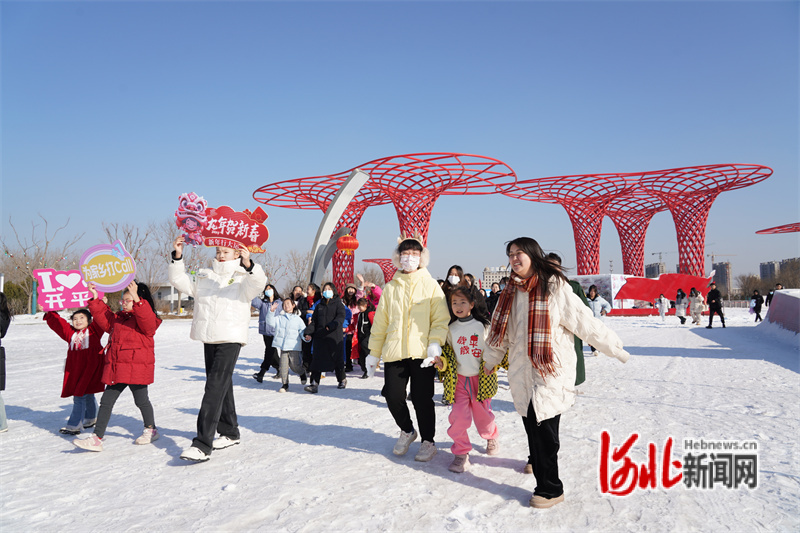 圖為大學(xué)生在唐山花海冰雪樂園與小朋友們一起嬉戲。