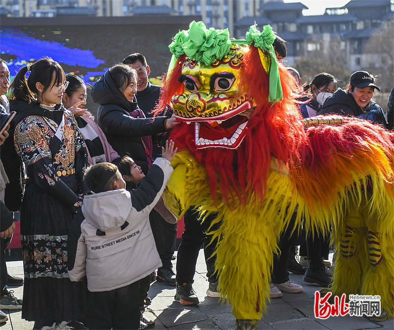 1月25日,游客在河北省遵化市尚禾源景區(qū)廟會觀看舞獅表演。